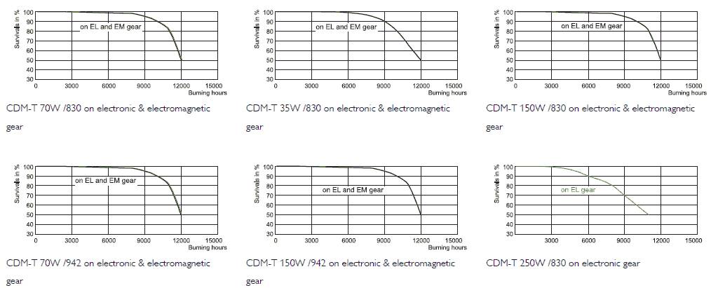 Lifetime of the Master Color CDM-T. 10% failure at 12,000 hours and 50% failure at 15,000 hours on electronic ballasts. The light output at 25 ° C is 83-95 Lm / watt which is very high. This CDM-T lamp is NOT dimmable.