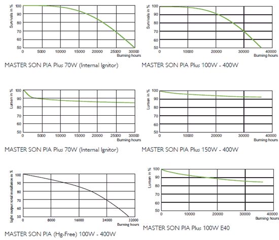 Lifetime of the SON APIA Plus Xtra. Failure of 5% at 24,000 hours and 50% failure at 38,000 hours on electronic ballast depending on lamp power. The light output at 25°C can reach up to 150 Lm/watt. This SON apia plus xtra lamp is dimmable.