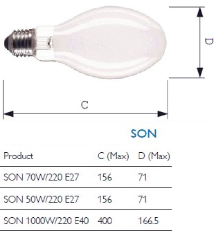 The SON is mainly used in public lighting, lighting up streets, tunnels and other general public places where security plays a role. With internal starter. Fitting: E27, Power: 50W Light Color: 2200K