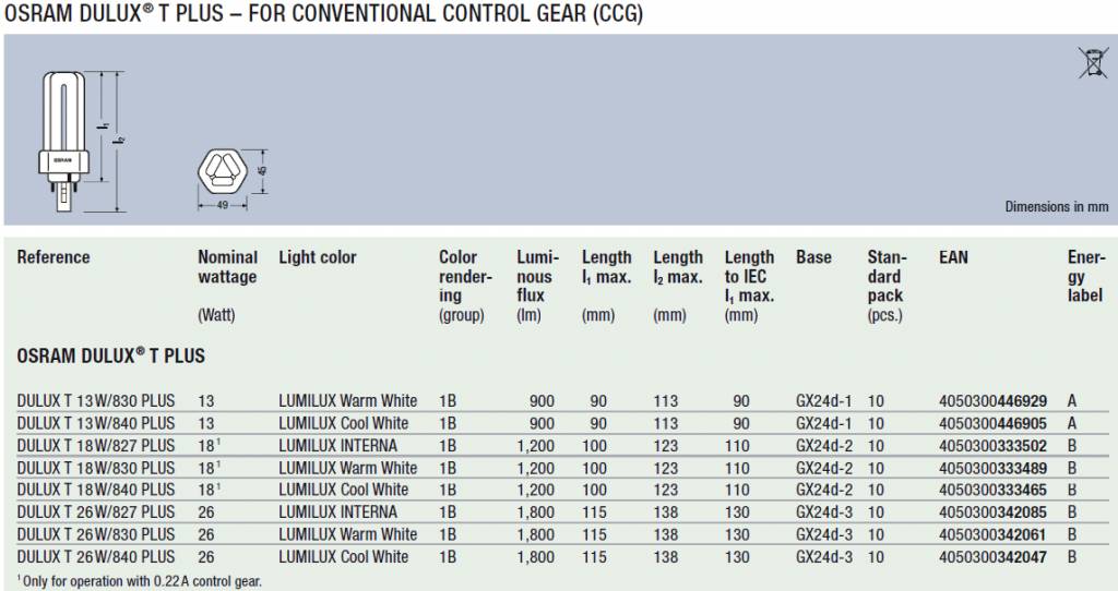 Lampe compacte à économie d'énergie avec 3 tubes étroits. Equipé d'un raccord enfichable à 2 broches (GX24d) Couleur de la lumière : Blanc froid (4000K) Puissance : 13 Watt