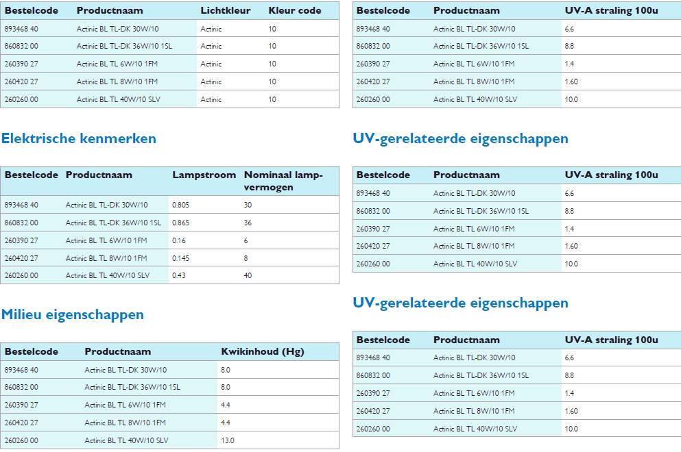 Ils sont également appropriés pour les processus photopolymérisation et reprographie. Dans les UV-A Philips propose un large choix de versions BL TL, BL et BL T5 TLD. Pour plus de sécurité, il y a une preuve Shatter option « Secura » spécial qui assure que les composants en verre sont maintenus dans un manchon extérieur spécial en cas de rupture accidentelle. Produit rayonnement UV-A grande longueur d'onde dans la plage de 350 à 400 nm. Ratio UV-B / UV-A est inférieure à 0,1% (UV-B 280-315 nm)