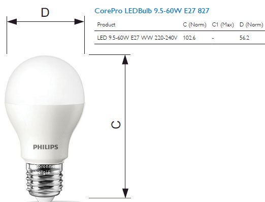 Lampe LED de classe énergétique A+ . Les lampes Philips CoreLEDBulb sont des remplacements de lampes à incandescence très économes en énergie avec un culot E27 « épais ». Ces lampes LEDBulb (LED « Light Bulb ») avec culot E27 sont utilisées sur une tension secteur 230V-240V. La puissance lumineuse est d'environ 63 lumens/watt, ce qui est assez élevé. C'est environ 5 fois plus qu'une lampe halogène.