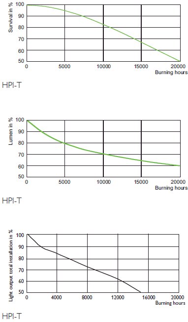La vie de l'HPI-T Plus. Le non 5% à 5000 heures et 50% des échecs 20000 heures. La sortie de la lumière à 25 ° C à 84 lumens / watt. Cette lampe HPI T est pas baissable.
