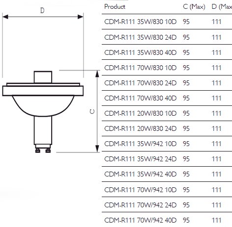 Application. Convient pour les luminaires ouverts dans les magasins, salles d'exposition et des vitrines. Cette lampe maître CDM-R111 facile bouchon de gx8.5 est utilisé avec un ballast électronique. Le MDP R111 a une conception de protection anti-éblouissement.