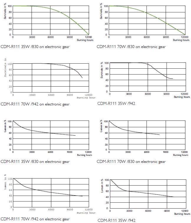 Durée de vie de Maître CDM-R111. La perte de 10% pour les heures 6.500, et l'échec de 50% pour 11.000 heures sur ballast électronique. Cette lampe couleur Maître CDMR111 est pas baissable.