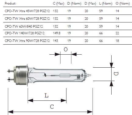 Durée de vie de CPO-TW. Renvoi de 10% à 16 000 heures et 20% de défaillances 30.000 heures. La sortie de la lumière à 25 ° C à 84 à 118 lumens / watt. La lampe CPO-TW est dimmable. Le temps de réamorçage maximale est de 720 secondes.
