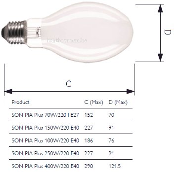 Candidature . Ce Philips SON APIA Plus Xtra est principalement utilisé pour l'éclairage public, l'éclairage des rues, des tunnels, des parkings et d'autres lieux publics où la sécurité joue un rôle. Souvent dans les luminaires et les lampadaires montés en surface. Les lampes SON APIA Plus Xtra avec culot E27 (seulement 70W) et E40 sont utilisées avec un ballast conventionnel. Convient pour une utilisation dans des luminaires fermés.