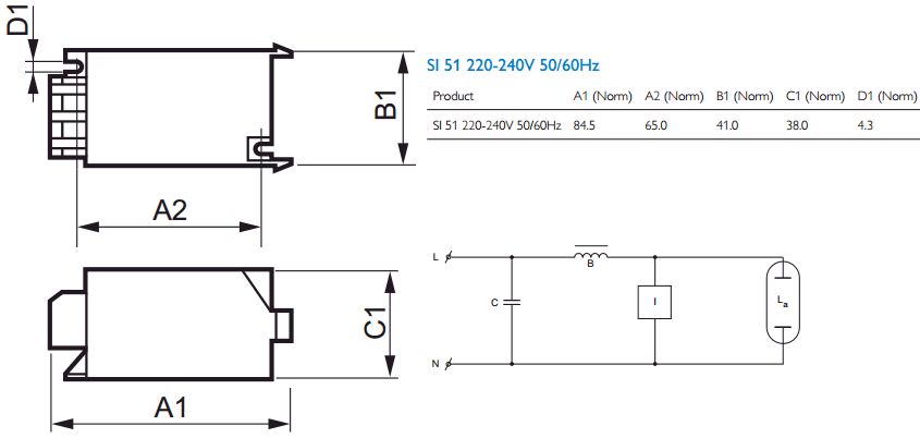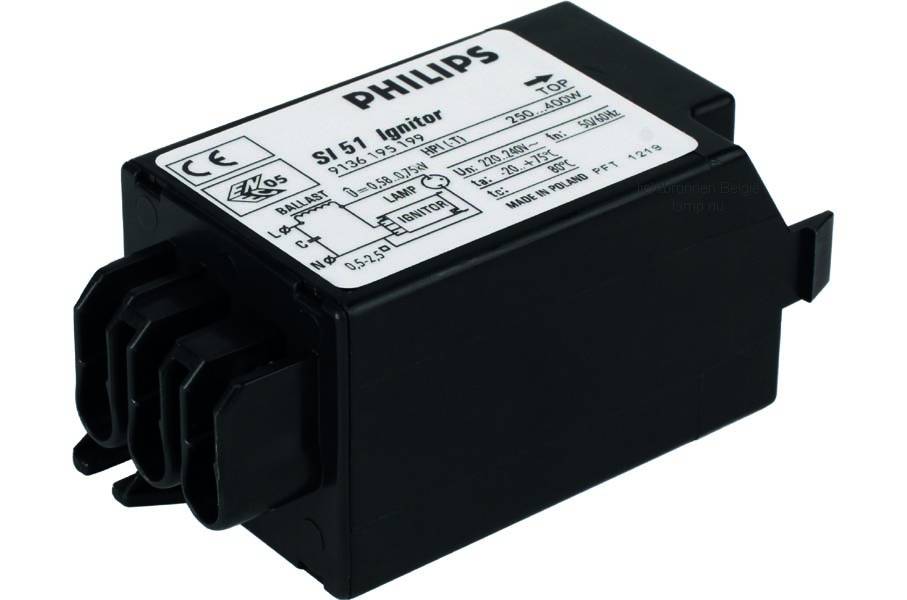 Allumeur électronique monobloc léger PHILIPS SI 51. Pour diverses lampes connectées en série telles que HPL et HP de 250W à 400W. Doit être utilisé en combinaison avec un ballast.