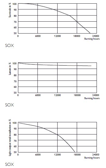 Durée de vie du MASTER SOX. 20 % de panne à 12 000 heures et 50 % de panne à 18 000 heures sur ballast électronique. Le rendement lumineux à 25°C est de 126-150 Lm/watt. Cette lampe Master SOX n'est PAS dimmable.