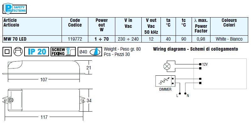 TCI 119772 Alimentation électronique LED Mini Wolf 70 LED pour tension 12V AC (alternative), lampes halogènes 70W ou lampes LED 50W (puissance réelle, pas de puissance de remplacement)